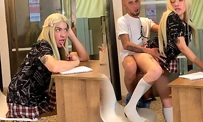 Two British 18 Yr Olds In School Uniform Wank Off Their Teacher And Get Coated In Cum