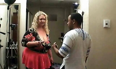 Fat ash-blonde with big saggy tits stumbles onto a Big Black Cock porn set